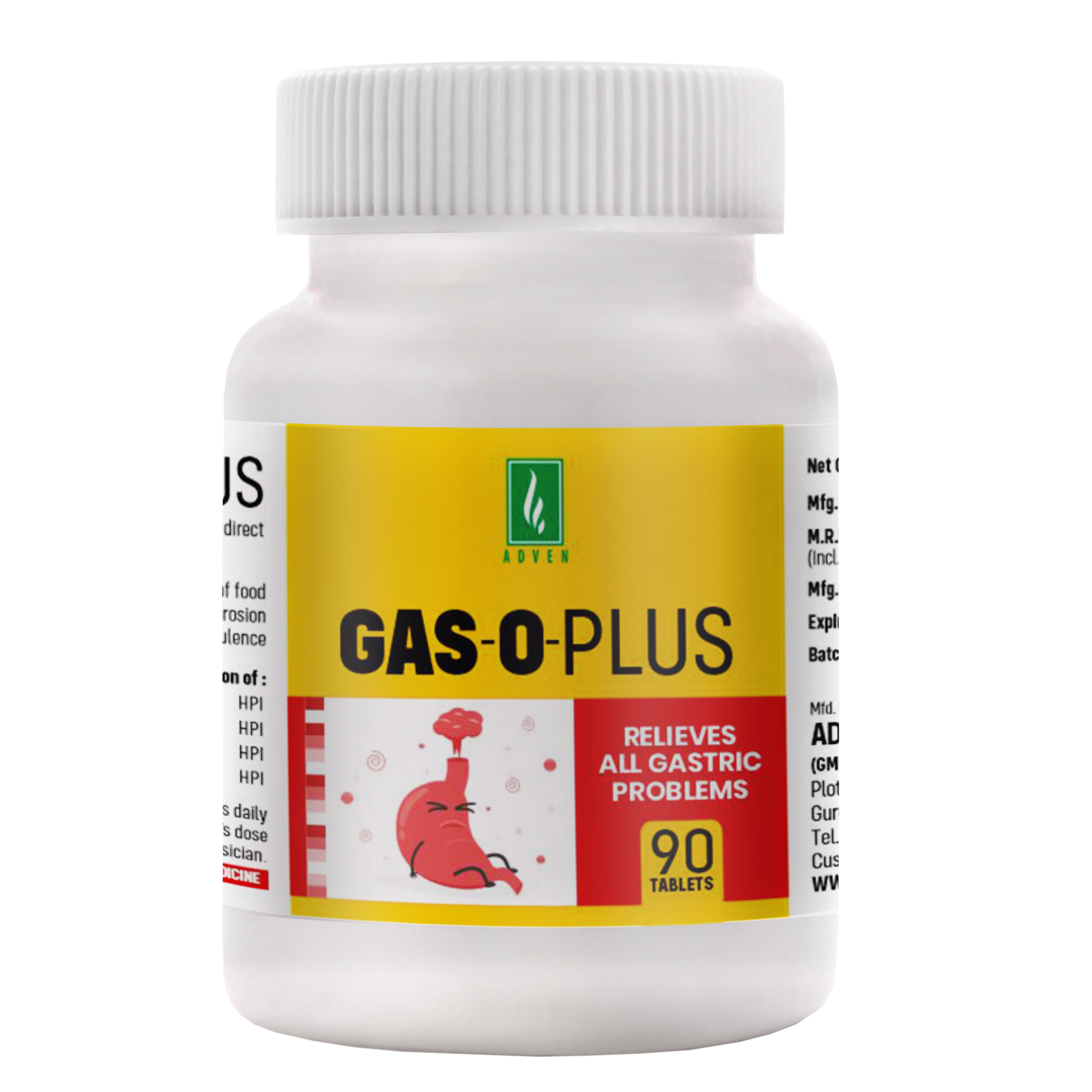 Adven's Gas-o-Plus tablet supports smooth digestion and excretion, alleviating gastric issues like flatulence, acidity, and stomach pain. It helps relieve symptoms such as regurgitation, nausea, vomiting, peptic ulcers, and belching.