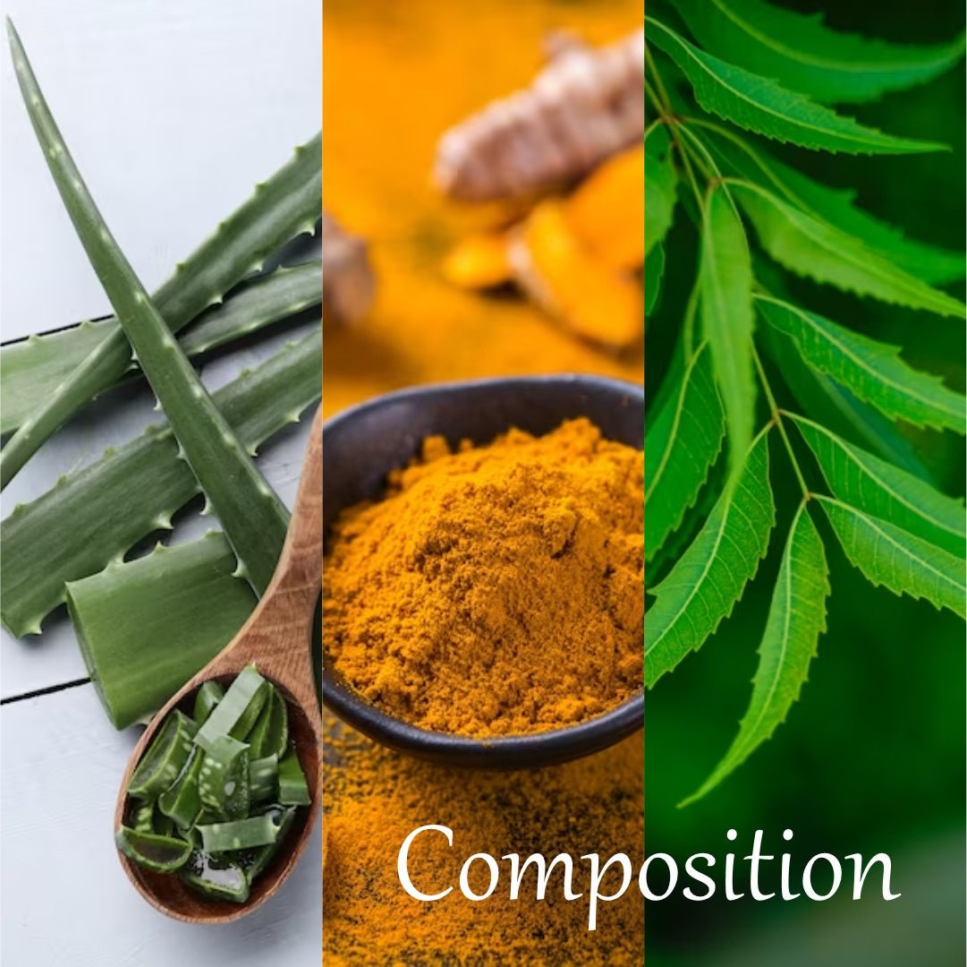 De-ionised Water, Sodium Lauryl Ether Sulphate, Synthalen W, Sodium Lauroyl Sarcosinate, Coco Amido Propyl Betaine, Glycerin, Galsik -700, Tween 20, Triethanolamine, Cocodiethanolamide, Neem Extract, Turmeric Extract, Aloevera Extract, Herbal Calendula Extract, Zinc PCA, Sodium Methyl Paraben, Sodium Propyl Paraben, Bronopol, Colour, Perfume