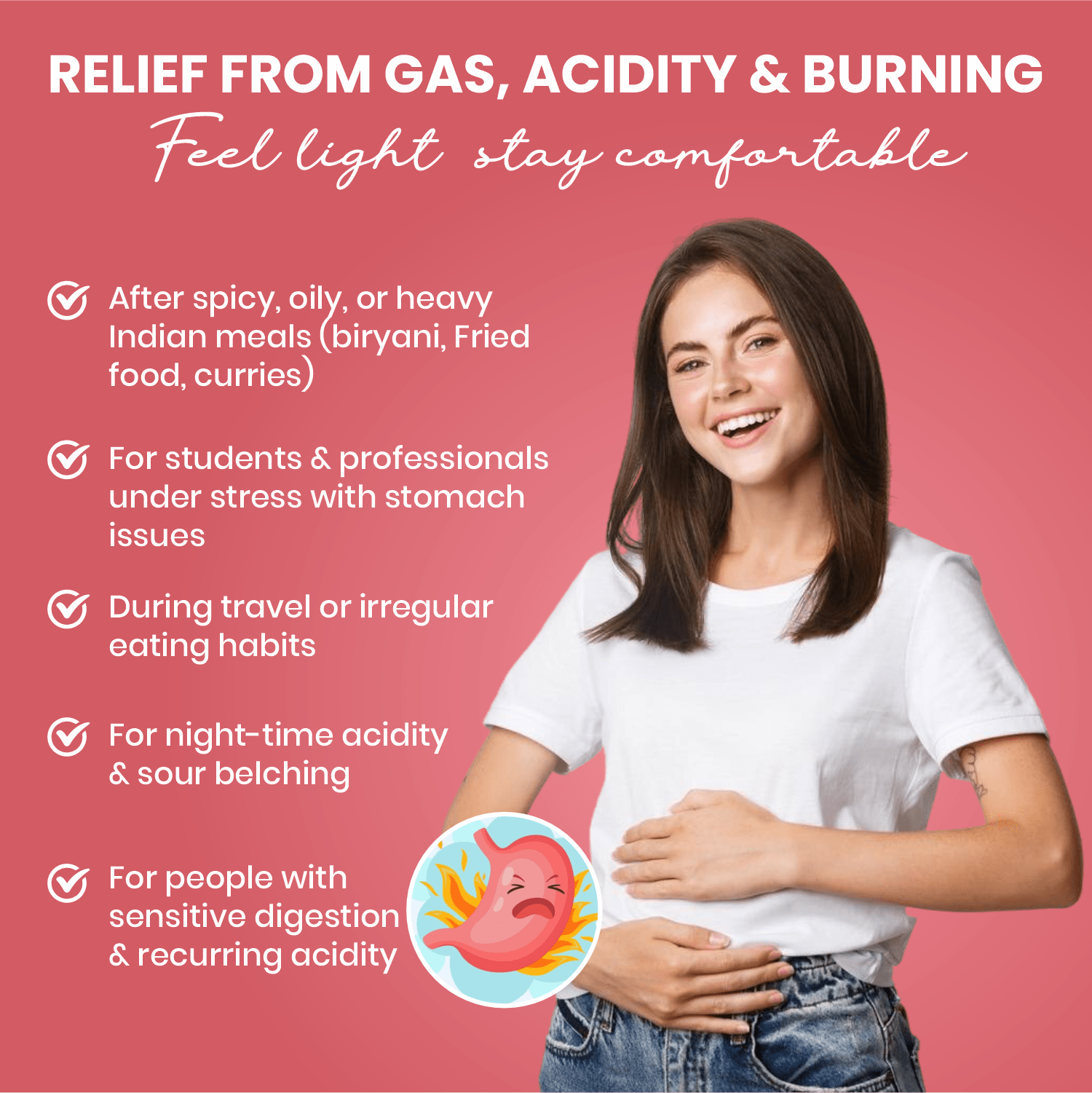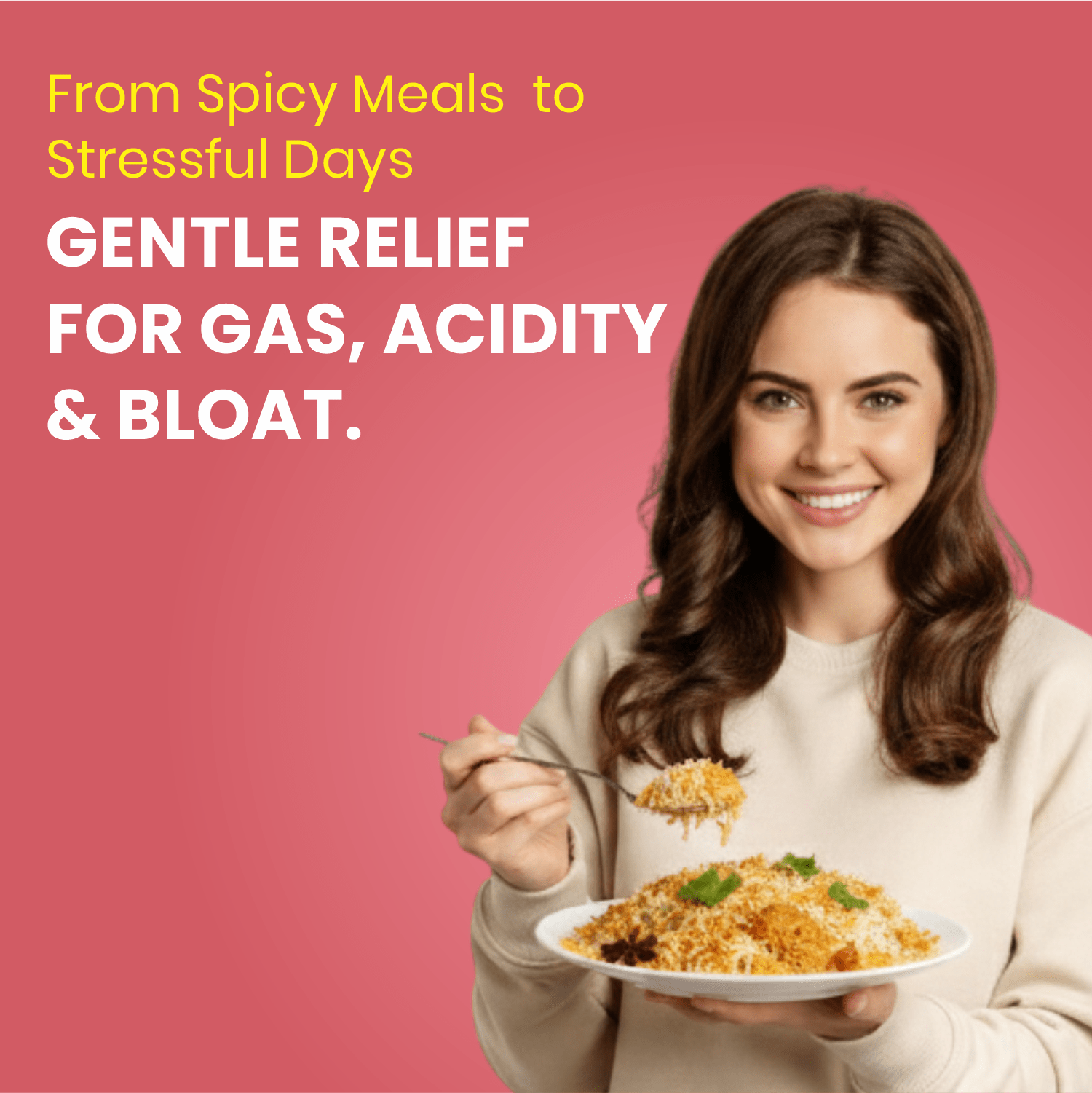 Adven's Gas-o-Plus tablet supports smooth digestion and excretion, alleviating gastric issues like flatulence, acidity, and stomach pain. It helps relieve symptoms such as regurgitation, nausea, vomiting, peptic ulcers, and belching.