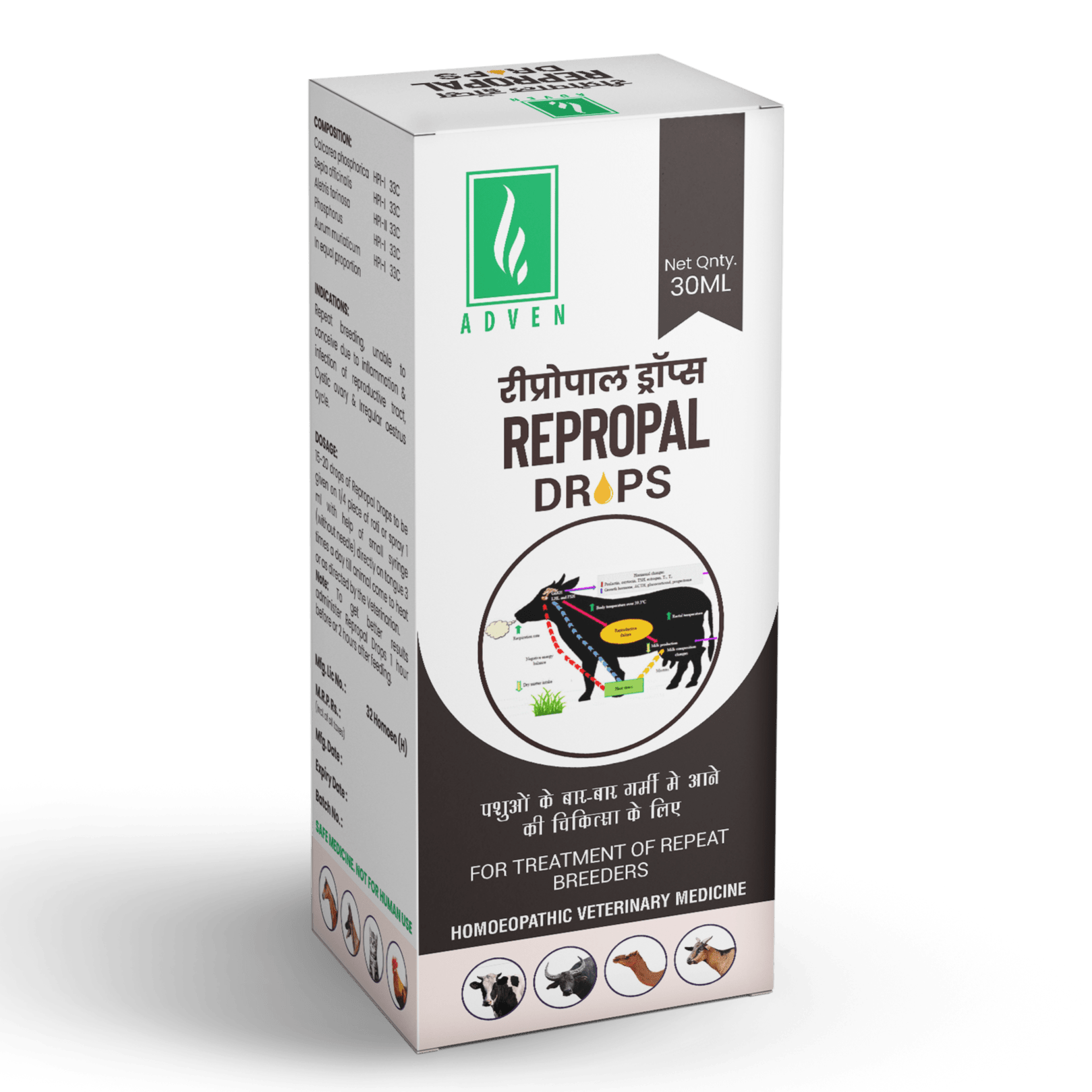 A repeat breeder is a female animal that has normal estrous cycle, is free from palpable clinical abnormalities, has no abnormal vaginal discharge, is less than 10 years old, has calved at least once but has failed to conceive after at least three or more consecutive inseminations. In case of Repeat breeding animals will come to heat regularly but not succeed to conceive after successful insemination. ADVEN REPROPAL VET Drops have all the necessary remedies that could relieve the animal from all the known causes of repeat breeding.