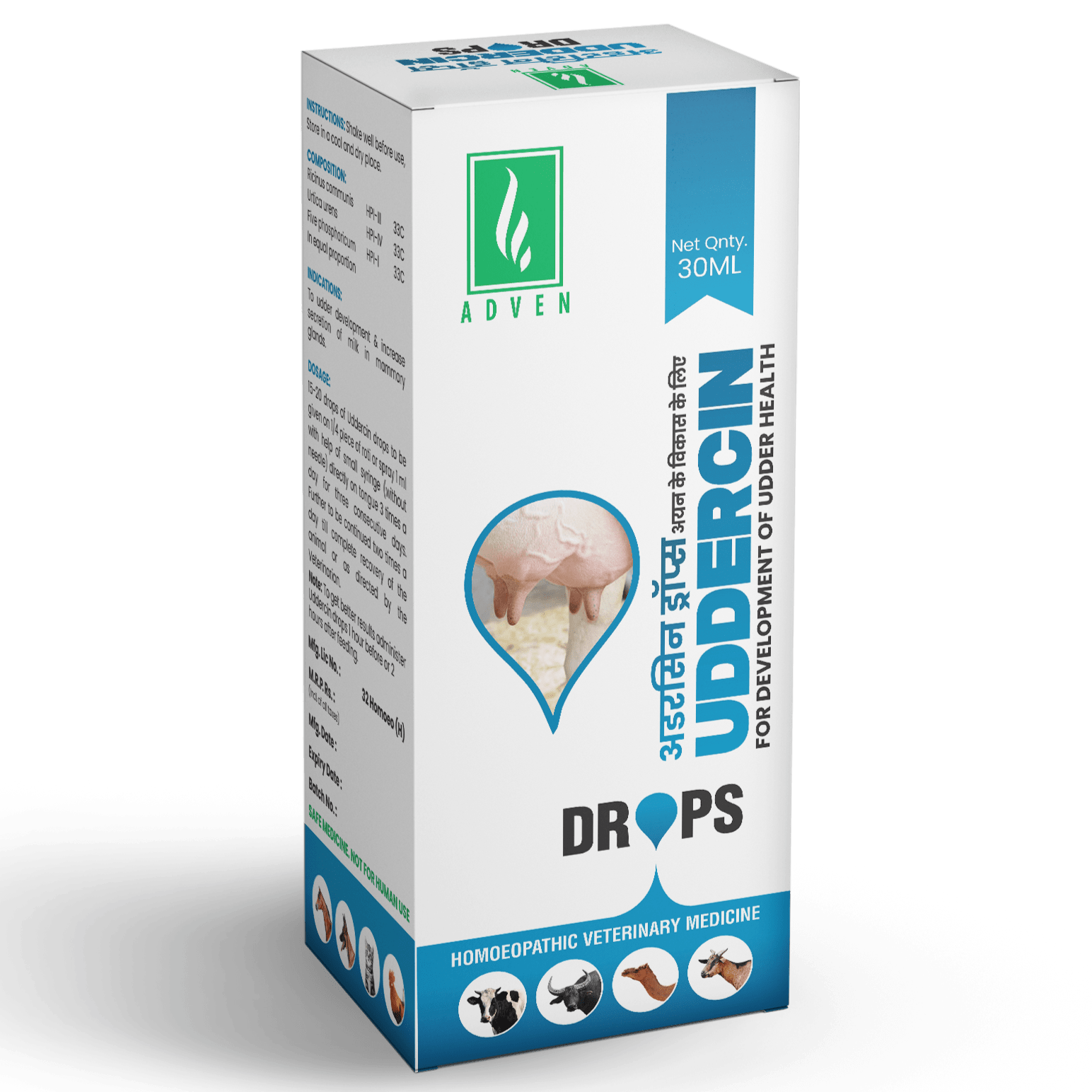 Premature symmetric development of the udder in cattle has been associated with chronic estrogenic stimulation resulting from cystic ovaries, feedstuffs containing excessive estrogens, and the mycotoxin zearalenone. In some cases, udder development is accompanied by vulvar swelling and affect the Milk Quantity. ADVEN UDDERCIN Drops is a comprehensive approach for Udder health/Ideal choice for the Undeveloped Udder.
